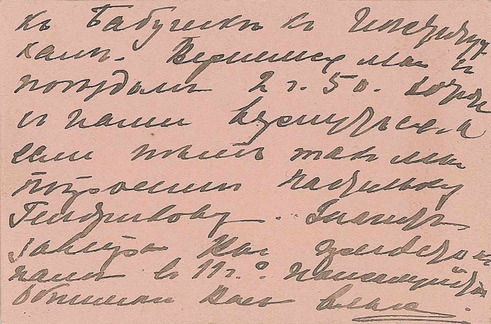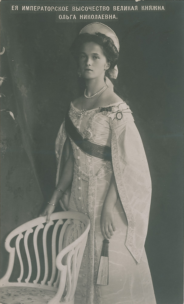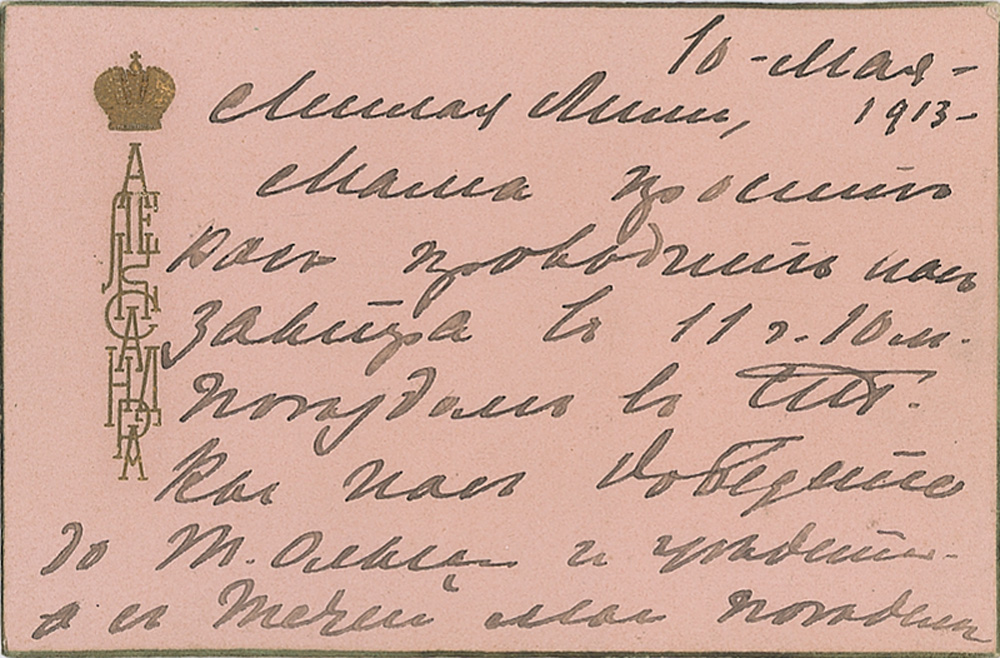 Grand Duchess (1895–1918) and eldest daughter of Emperor Nicholas II and Empress Alexandra of Russia, who was assassinated along with her family following the Russian Revolution of 1917. ANS in Russian, signed “Olga,” one page both sides, 3.75 x 2.5, Alexandra Feodorovna embossed personal stationery card, May 10, 1913. Note to Lili Dehn. In full (translated): “Mother asks that you take us tomorrow to the St. Petersburg train leaving at 11:10. You will drive us as far as Aunt Olga’s and you will leave. We will go with auntie to visit grandma at the institution. We will return on the 2:50 train. Would you like to come along and return with us? If not, we will ask Nastenka Hendrikov. That means that tomorrow you will arrive at our house at 11:00 in the morning.” In fine condition. Accompanied by the original envelope and an unsigned real photo postcard of the Grand Duchess. RR Auction COA.