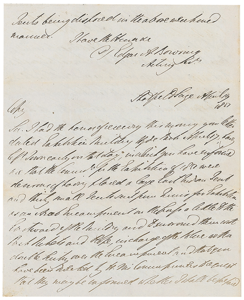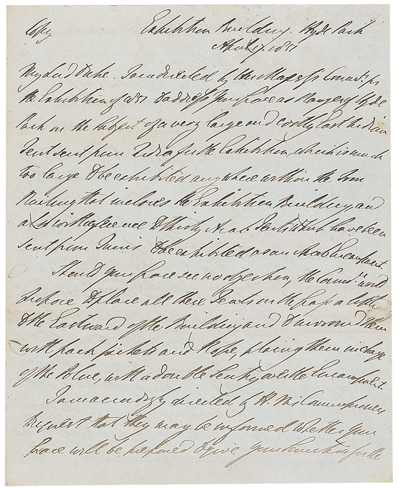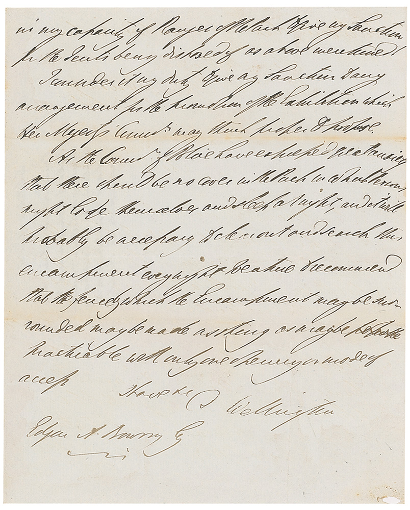 ALS signed “Wellington,” three pages on two adjoining sheets, 7.5 x 9, April 19, 1851. Letter to Edgar A. Bowring upon the opening of the Great Exhibition in Hyde Park. Wellington copies out Bowring’s initial letter and then responds, in part: “You have informed me that the Commissioners for the Exhibition of 1851 were desirous of having placed a large East Indian Tent and thirty small Tents sent from Tunis for Exhibition as an Arab Encampment…I consider it my duty to give my sanction to any arrangement for the promotion of the Exhibition which Her Majesty‘s Commissioners may think proper to propose…l venture to recommend that the fence by which the Encampment may be surrounded may be made as strong as may be practicable with only one opening or mode of access.” In fine condition, with intersecting folds, one vertical fold passing through a single letter of the signature, and light scattered toning. Pre-certified PSA/DNA and RR Auction COA.