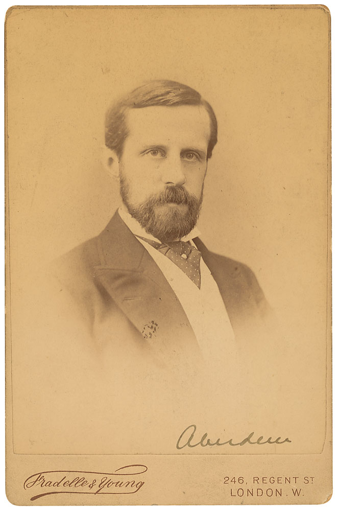 Scottish politician (1847–1934) who served as Lord Lieutenant of Ireland and the seventh Governor General of Canada. Original 4.5 x 6.5 cabinet photo by Fradelle & Young of London, signed at the bottom of the image in black ink, “Aberdeen.” In fine condition. RR Auction COA.
