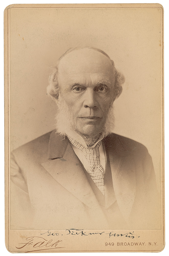 Lawyer (1812–1894) who served as co-counsel for Dred Scott in the famous Supreme Court case. Original 4.25 x 6.5 cabinet photo by Falk of New York, signed in the lower border in black ink, “Geo. Ticknor Curtis.” In fine condition, with a few light corner tip dings. RR Auction COA.