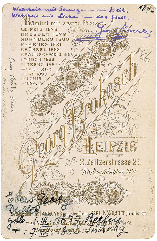 Egyptologist and novelist (1837–1898) who discovered one of the most important ancient Egyptian medical papyri. Original 4.25 x 6.5 cabinet photo by Georg Brokesch of Leipzig, signed in the lower border in blue ink, and signed on the reverse with two lines of German, most likely a couplet from a poem. In fine condition, some light rubbing to the lower border and an ink notation to the reverse. RR Auction COA.
