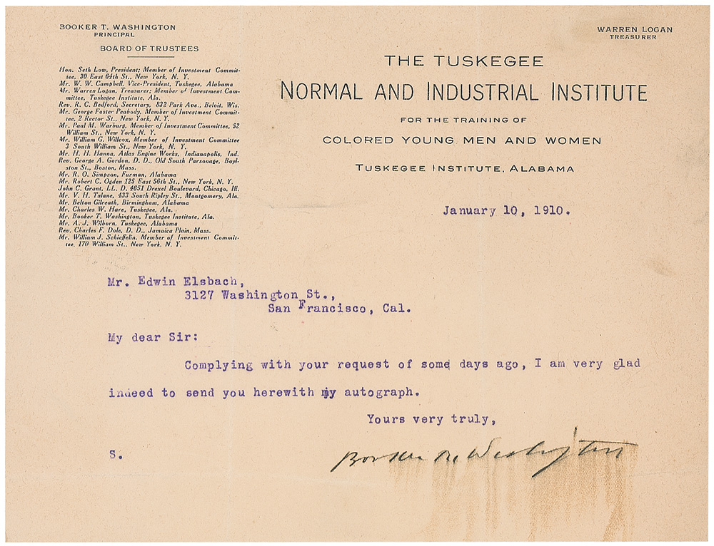 TLS, one page, 8.5 x 6.5, Tuskegee Institute letterhead, January 10, 1910. Response to an autograph request. In full: “Complying with your request of some days ago, I am very glad to send you herewith my autograph.” In very good condition, with intersecting folds, one vertical fold passing through a single letter of the signature, light scattered soiling, and moderate brushing to the signature. RR Auction COA.