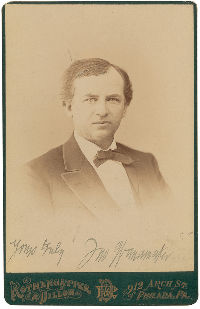 Department store magnate (1838–1922) who also served as Postmaster General from 1889 to 1893. Original 4.25 x 6.5 cabinet photo by Rothengatter & Dillon of Philadelphia, signed at the bottom of the image in black ink, “Yours truly, John Wanamaker.” In fine condition, with some mild soiling. RR Auction COA.