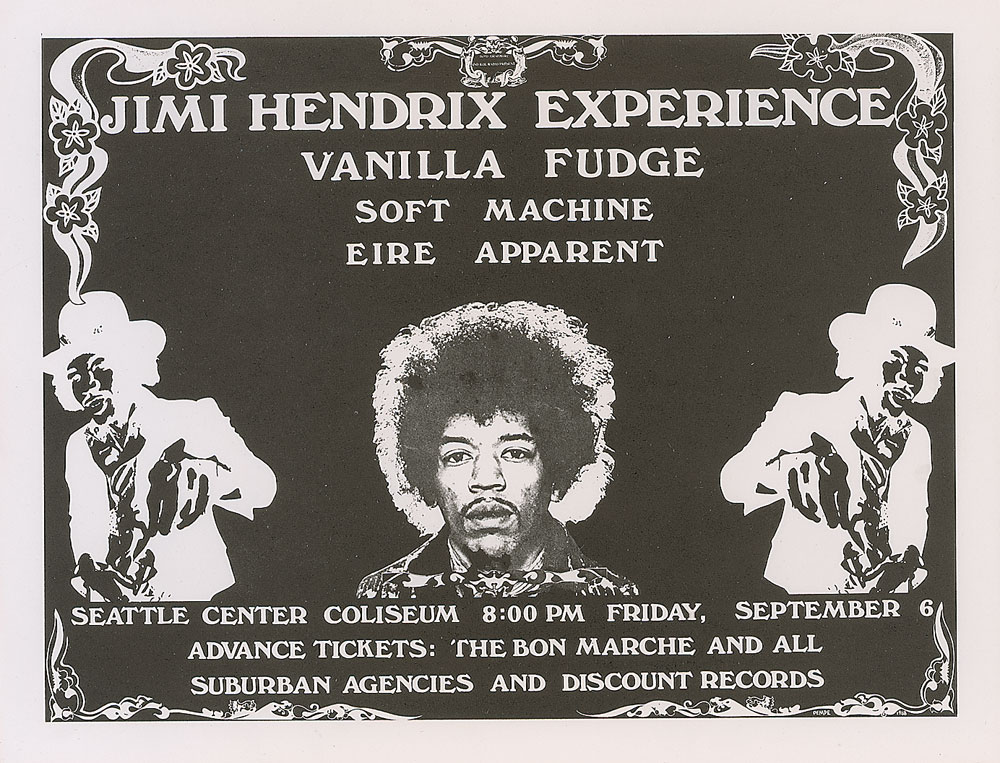 Original handbill, 11 x 8.5, for The Jimi Hendrix Experience concert at the Seattle Center Coliseum on September 6, 1968. Also appearing were Vanilla Fudge, Soft Machine, and Eire Apparent. In fine condition. Hendrix played 11 songs at the show including Purple Haze, Foxy Lady, and Voodoo Child. RR Auction COA.