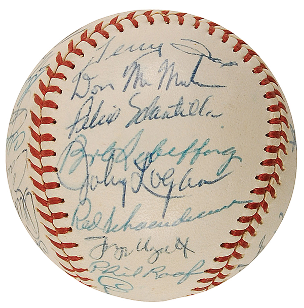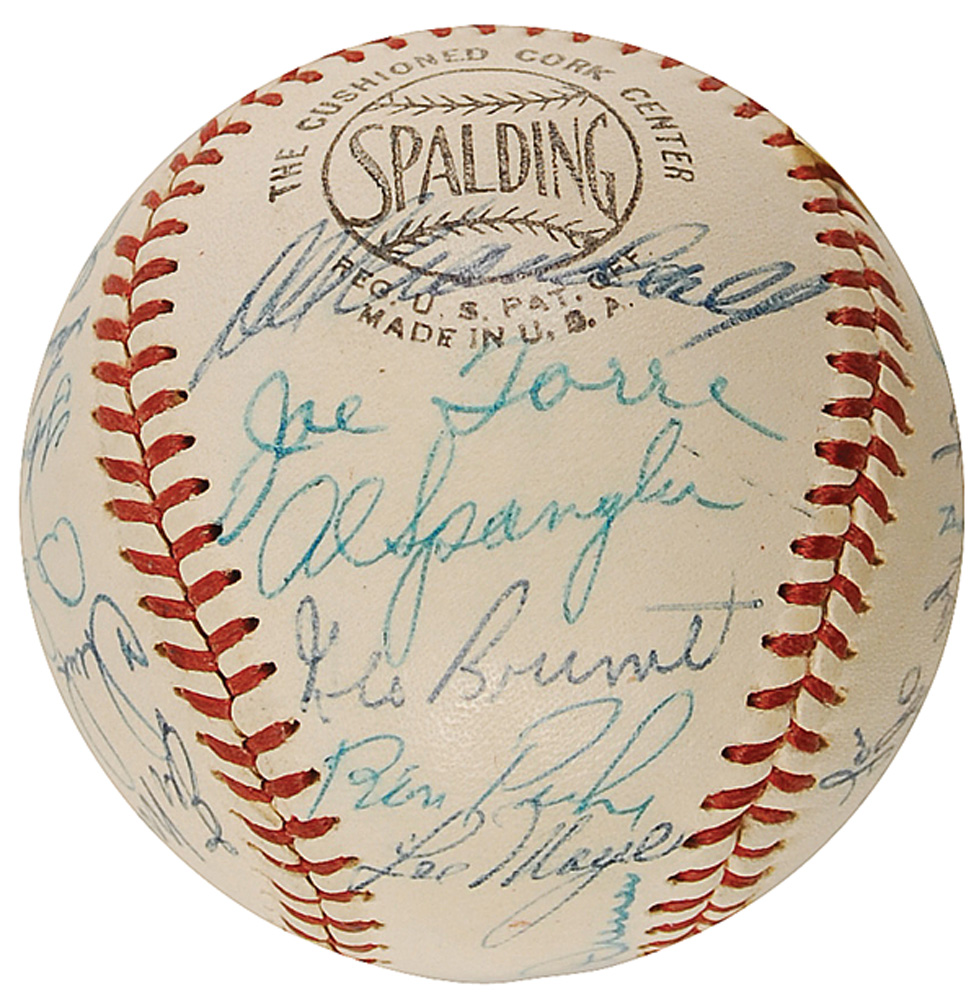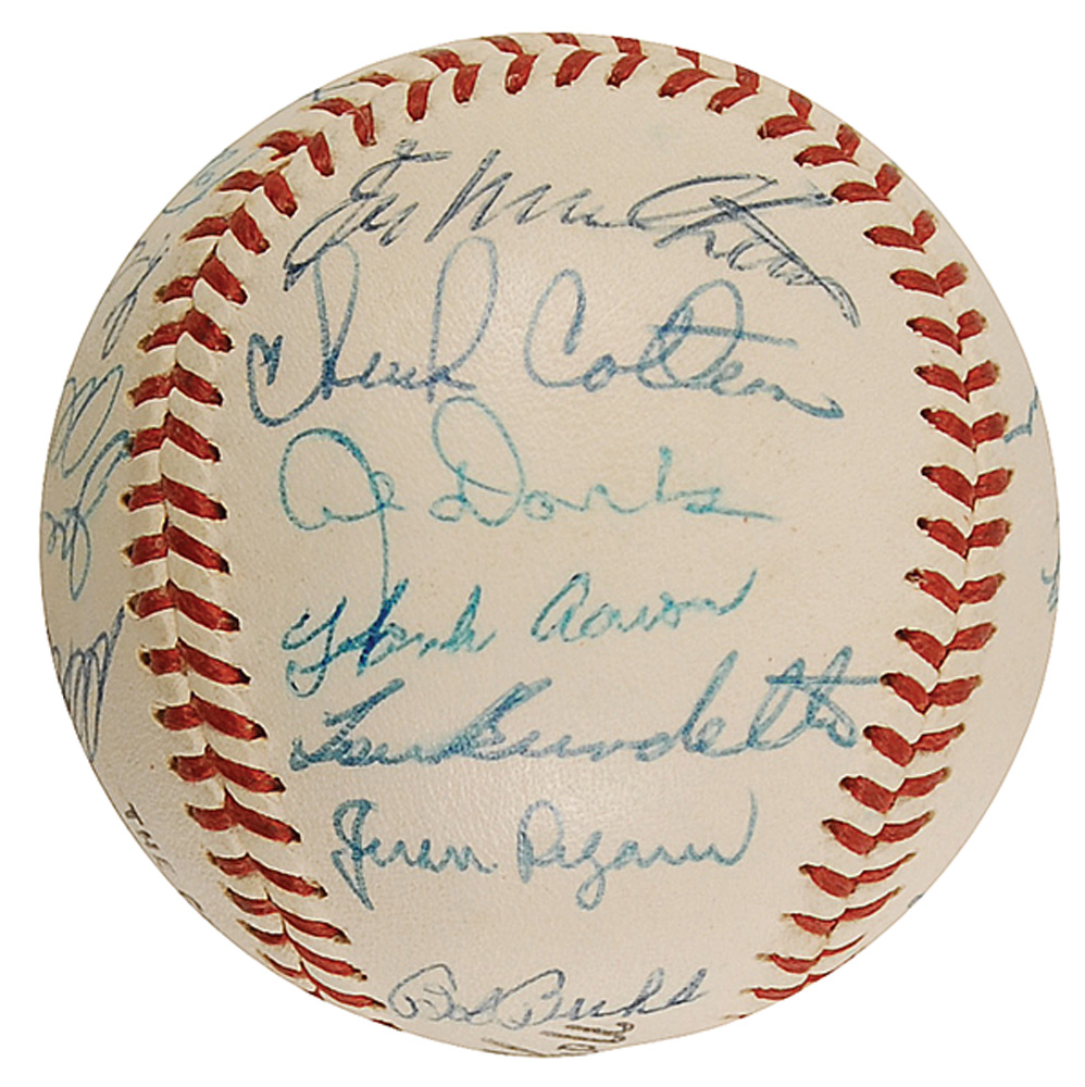 Official Spalding Warren Giles National League baseball signed in blue ballpoint on the sweet spot and side panels by 30 members of the 1960 Braves ball club. Signers are: Hank Aaron, Eddie Mathews, Warren Spahn, Red Schoendienst, Chuck Dressen (ss), Lew Burdette, Joe Torre, Joe Adcock, Andy Pafko, Al Dark, Johnny Logan, Juan Pizarro, Bob Buhl, Del Crandall, Chuck Cottier, Al Spangler, George Brunet, Ron Piche, Lee Maye, Charlie Lau, Carl Willey, Eddie Haas, Bill Bruton, Mel Roach, Terry Fox, Don McMahon, Felix Mantilla, Phil Roof, George Myatt, and Bob Scheffing. In fine condition. Pre-certified Steve Grad/PSA/DNA and RR Auction COA.