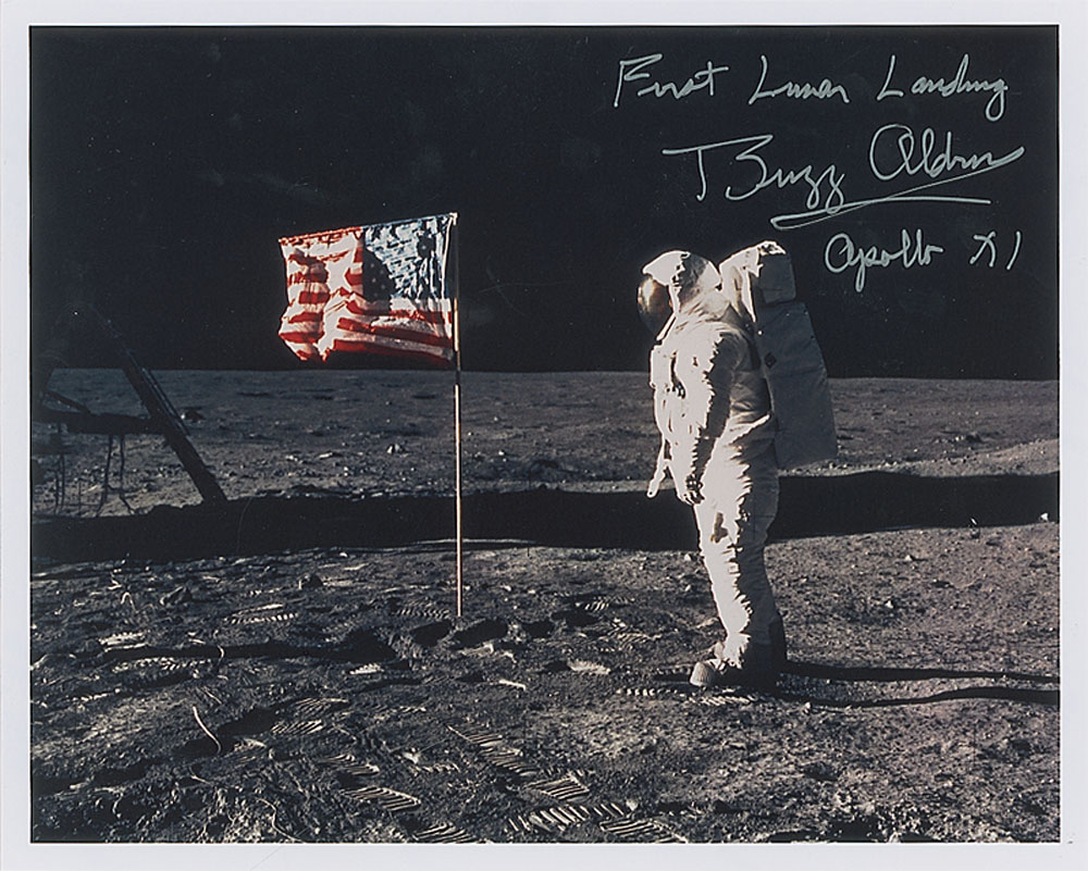 Color satin-finish 10 x 8 photo of Aldrin standing by the American flag on the moon, signed in silver ink, “First Lunar Landing, Buzz Aldrin, Apollo XI.” In very fine condition. Pre-certified Steve Zarelli and RR Auction COA.