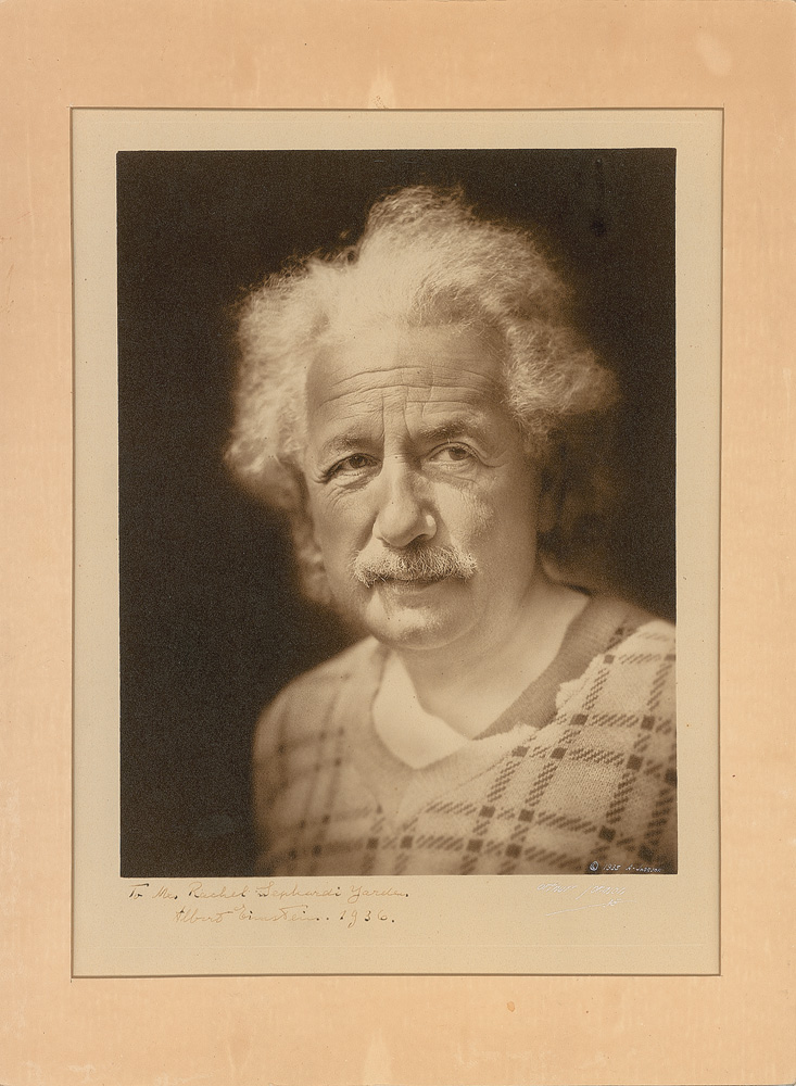 Vintage matte-finish 8.25 x 11 photo of Einstein bathed in soft light, taken by Arthur Johnson circa 1935, signed and inscribed in the lower border in fountain pen “To Mrs. Rachel Sephardi Yarden, Albert Einstein 1936.” Photo also bears a white ink photographer’s notation to lower right. Photo is matted to an overall size of 10.25 x 14. In fine condition, with Einstein’s signature and inscription fairly light, but still completely legible. A great casual image of Einstein, with a copy of this exact Johnson portrait displayed in the National Portrait Gallery in Washington, D. C. Pre-certified John Reznikoff/PSA/DNA and RR Auction COA.