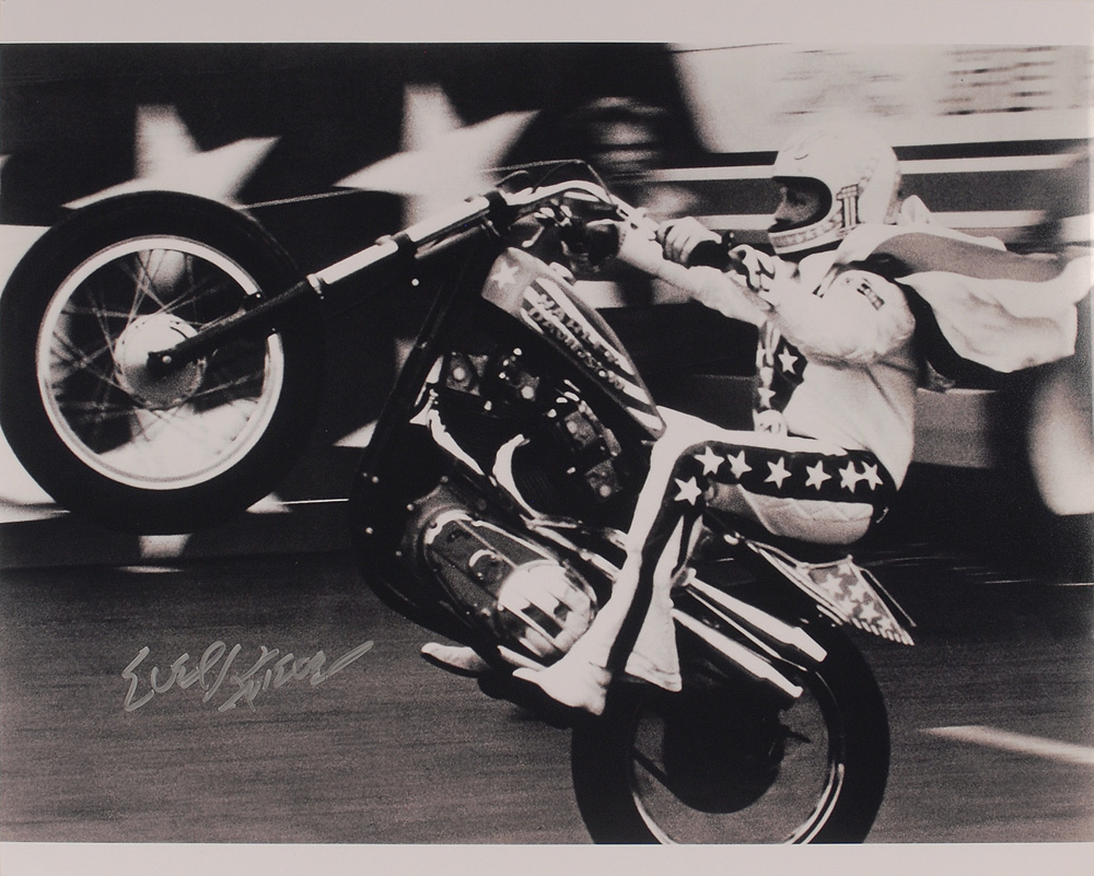 Satin-finish 20 x 16 photo of Knievel riding his motorcycle on one wheel, signed in silver ink. In fine condition. RR Auction COA.