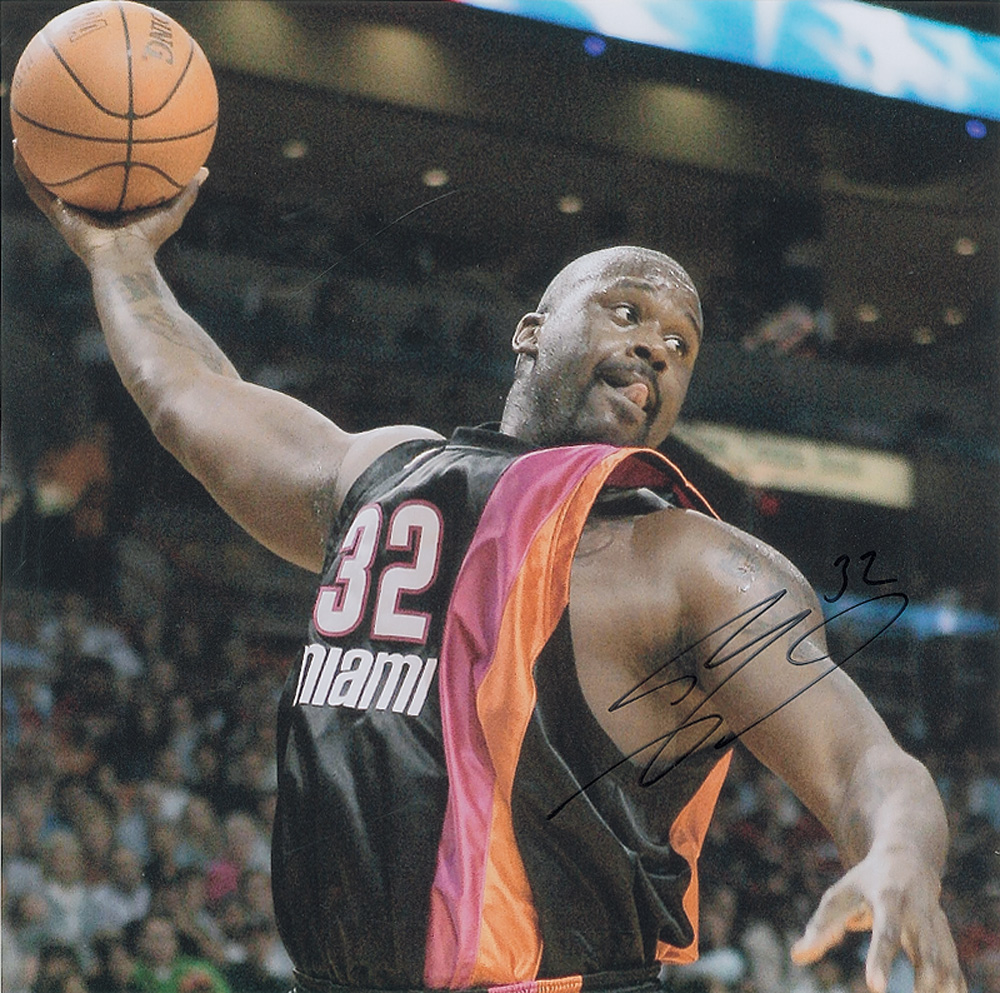 Color satin-finish 12 x 12 photo of Shaq on the court for the Miami Heat, signed in black felt tip. In very fine condition. Pre-certified Steve Grad/PSA/DNA and RR Auction COA.