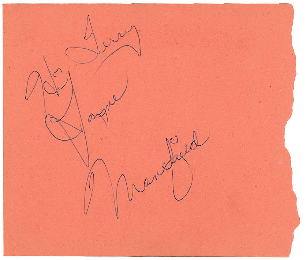 Vintage ballpoint signature and inscription, “Hi Terry, Jayne Mansfield,” on a salmon-colored 5.5 x 5 album page. In fine condition, with a rough right edge which could be easily matted out. Pre-certified PSA/DNA and RR Auction COA.