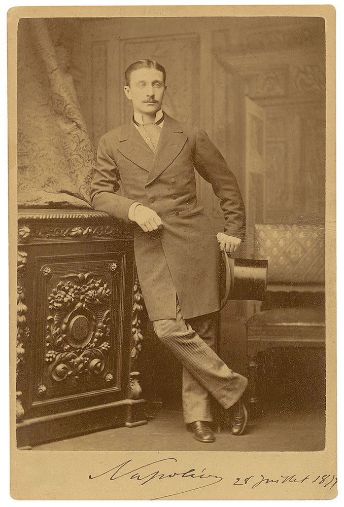 Prince Imperial of the French Bonaparte dynasty (1856–1879), and the only child of Napoleon III. His early death in Africa, at the hands of Zulu warriors, sent shock waves throughout Europe. Handsome original 4.25 x 6.5 full-length cabinet photo by Alexander Bassano of London, signed in the lower border in black ink, “Napoleon 28 Julliet 1877.” In fine condition, with some mild horizontal creasing to center portion, not affecting overall appearance. Just the third Bonaparte item we have ever offered, and the first signed photo. RR Auction COA.