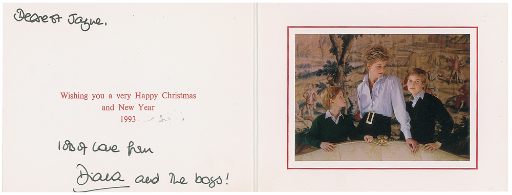 Christmas card from 1993, 8 x 6 folded, opens to 16 x 6, embossed in gold on the outside with the family arms. Inside, the card bears a charming color satin-finish 5.5 x 4 color family photograph of Diana, William, and Harry posing in front of a tapestry. Printed opposite the photograph is the sentiment “Wishing you a very Happy Christmas and New Year 1993.” Diana has inscribed the card, ”Dearest Jayne,” and signed at the bottom, “lots of love from Diana and the boys!” In fine condition, with some stray ink marks next to printed sentiment. Accompanied by the original transmittal envelope, addressed by Diana, “Jayne,” and signed in the lower left corner, “D.” Also accompanied by the original mailing envelope, addressed to Jayne Kear at Walt Disney World Corporation. Despite the absence of Prince Charles in the photograph or in the card, the couple was still married. It was not until 1996 that the divorce was finalized. Pre-certified John Reznikoff/PSA/DNA and RR Auction COA.