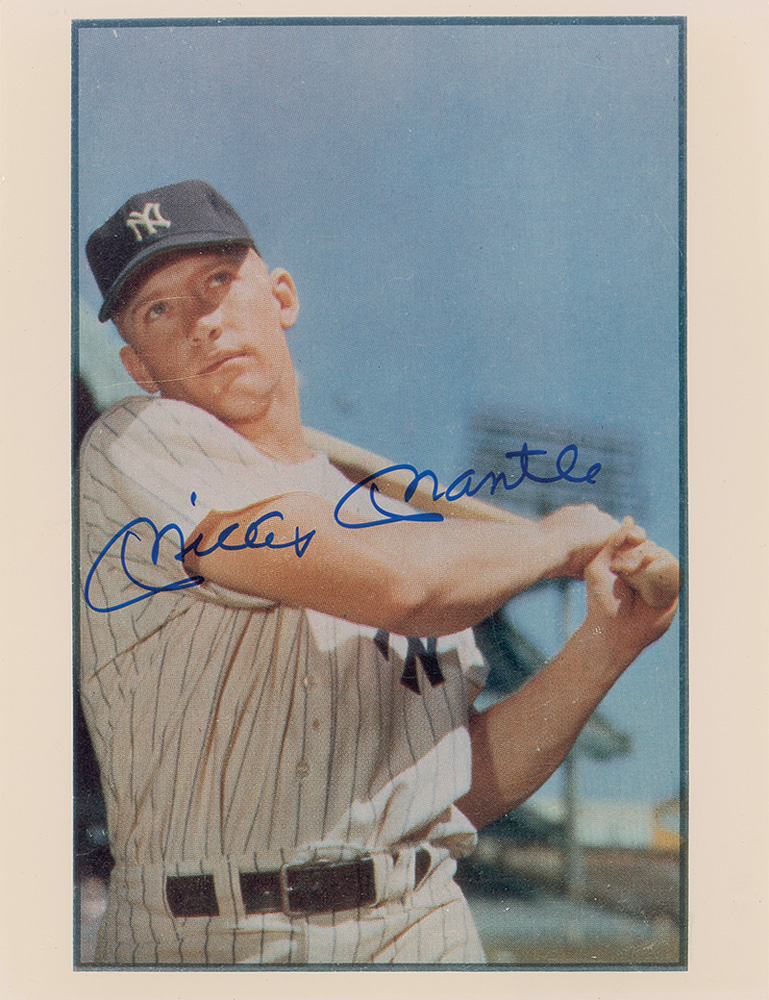 Color satin-finish 8 x 10.25 photo of Mantle’s 1953 Bowman baseball card, signed in blue felt tip. In fine condition. Pre-certified Steve Grad/PSA/DNA and RR Auction COA.