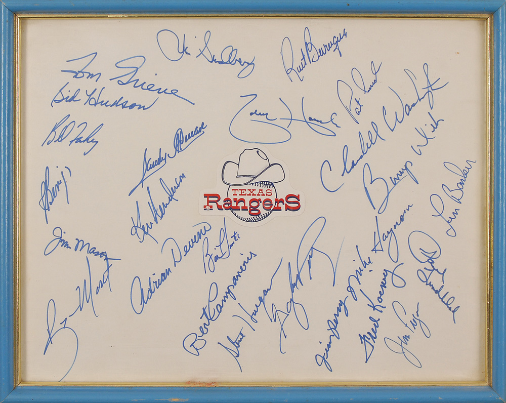 Twenty-four felt tip signatures from the 1977 Texas Rangers team on an off-white 13.5 x 10.5 cardstock sheet with a Rangers logo affixed to the center. Signers include: Gaylord Perry, Bert Campaneris, Mike Hargrove, Len Barker, Toby Harrah, Tom Grieve, Claudell Washington, Sandy Alomar, Bump Wills, Ken Henderson, and Jim Fregosi. Framed to an overall size of 14.75 x 11.75. Some light toning and soiling, otherwise fine condition. Pre-certified Steve Grad/PSA/DNA and RR Auction COA.