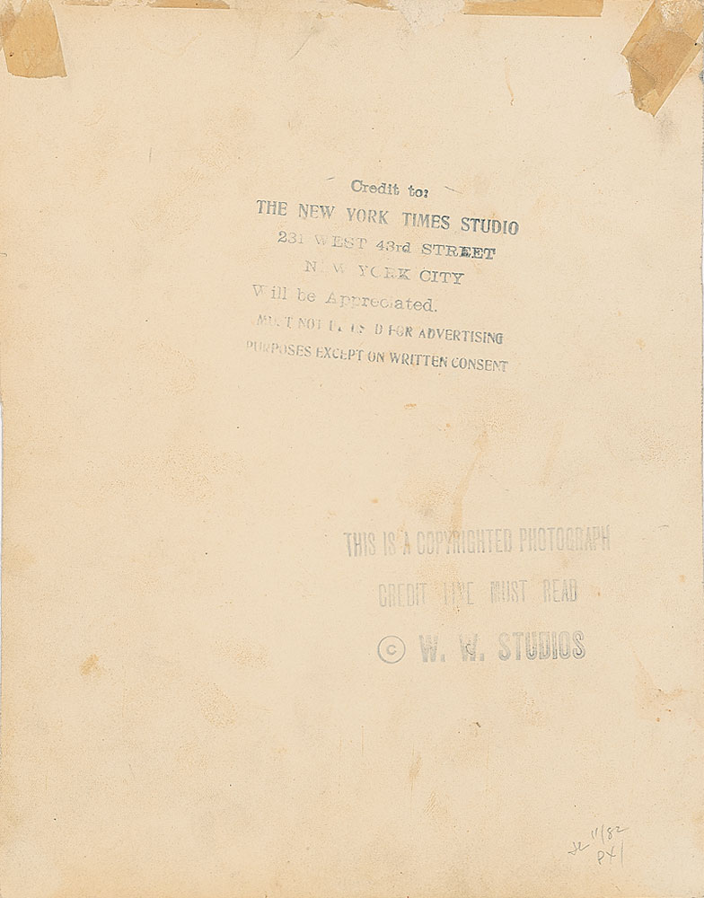 Vintage glossy 7.75 x 10 double weight New York Times Studio head-and-shoulders photo, signed in fountain pen. In very good condition, with scattered creases and surface marks, a bit of light crazing to finish, and lightly trimmed vertical edges. RR Auction COA.