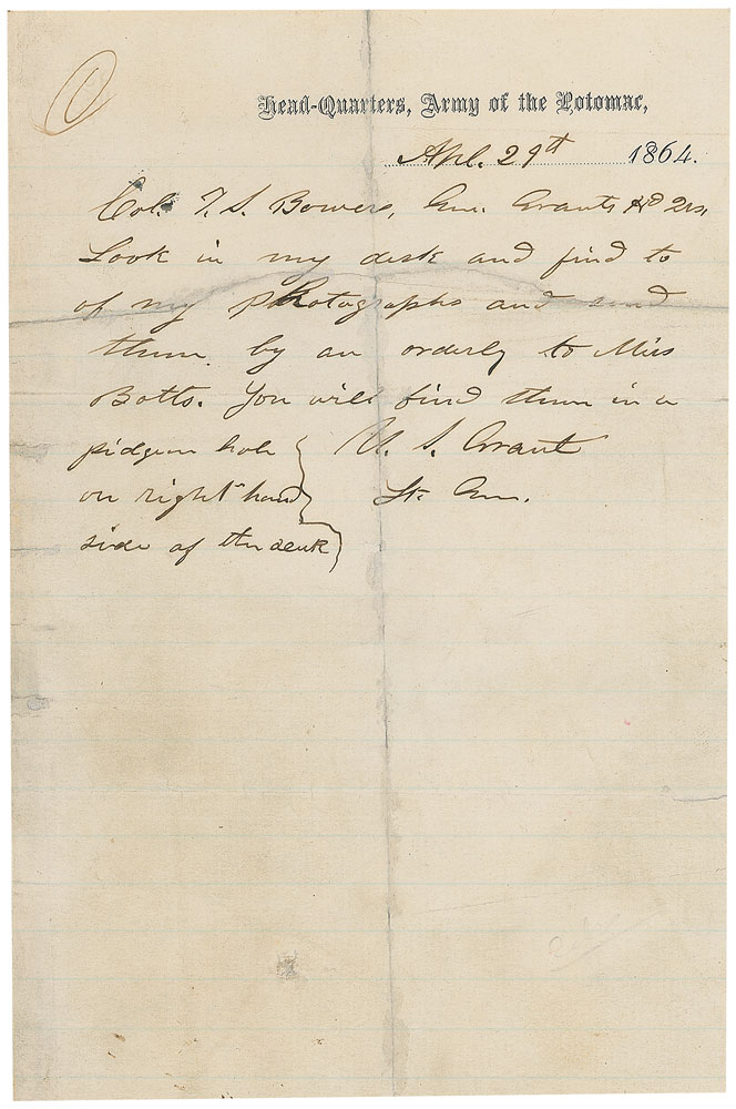 War-dated ALS signed “U. S. Grant, Lt. Gen.,” one page, lightly-lined, 4.75 x 7.25, Headquarters, Army of the Potomac letterhead, April 29, 1864. Letter to “T. S. Bowers, Gen. Grant’s Hd. Qrs.” In full: “Look in my desk and find to [sic] of my photographs and send them by an orderly to Miss Botts. You will find them in a pidgeon hole on the right hand side of my desk.” Intersecting folds, one through a single letter of signature, ink notation to top left, and scattered soiling, otherwise fine condition. RR Auction COA.