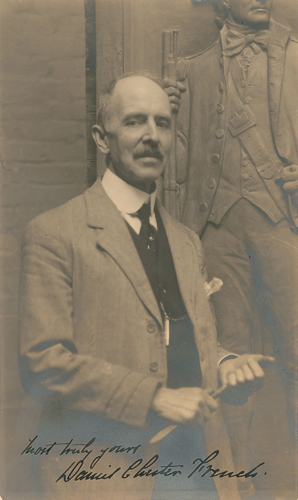American sculptor (1850–1931) best known for his monumental historical works, most notably the sculpture that forms the centerpiece of the Lincoln Memorial. Two items: one vintage matte-finish 3.75 x 6.25 photo of French in front of a minuteman relief, signed at the bottom in black ink, “Most truly yours, Daniel Chester French”; and one ALS signed “Daniel C. French,” one page, 8 x 10, personal letterhead, New York, November 26, 1898, in part: “Will you be kind enough to send me three unmounted photographs of the Minute Man—the best plate you have.” Silvering to dark areas of the image, and intersecting folds, moderate block of toning, and a couple repaired tears to the letter, otherwise fine condition. RR Auction COA.