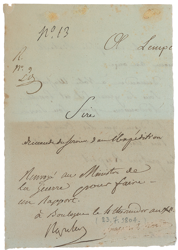 Fantastic and full endorsement signature, “Napoleon,” on the front of a partial self-contained untranslated manuscript document, one page, both sides, 4.25 x 6, addressed at the top, “Sire,” and dated in pencil “July 23, 1804.” Napoleon orders a request for serving in his army to be sent for a report at the Ministry of War. Uniform toning to lower half of page, some scattered soiling and adhesive remnants, and trimmed edges, otherwise fine condition. Pre-certified John Reznikoff/PSA/DNA and RR Auction COA.