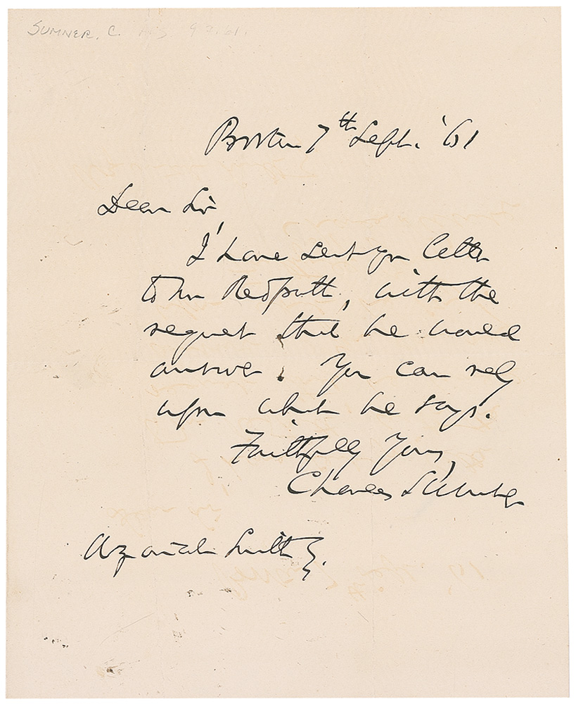 ALS, one page, 6.5 x 8, September 7, 1861. Letter to a gentleman, in part: “I have sent your letter to Mr. Redputt…You can rely upon what he says.” In fine condition, with intersecting folds, one through a single letter of signature, and pencil notation to top left. Accompanied by an ink signature, “C. Sumner,” on an off-white clipped slip. RR Auction COA.
