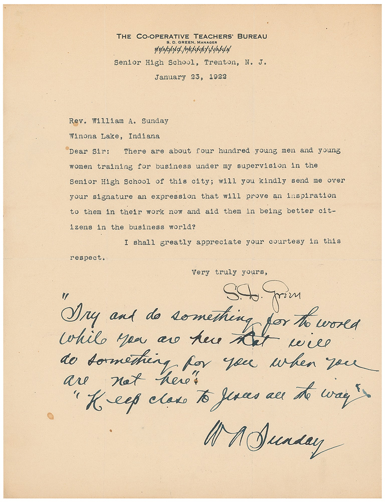 Evangelist (1862–1935) and former baseball player who preached a fundamentalist theology in a highly flamboyant style. AQS, one page below a typed letter on an 8.5 x 11 off-white sheet, January 23, 1922. Sunday’s response to the letter, asking him for an inspirational quote. In full: “‘Try and do something for the world while you are here that will do something for you when you are not here,’ ‘Keep close to Jesus all the way,’ W. A. Sunday.” Intersecting folds, one vertical fold passing through a single letter of the signature, slight separations to horizontal fold, and light scattered toning and soiling, otherwise fine condition. Accompanied by a postcard depicting Sunday. RR Auction COA.