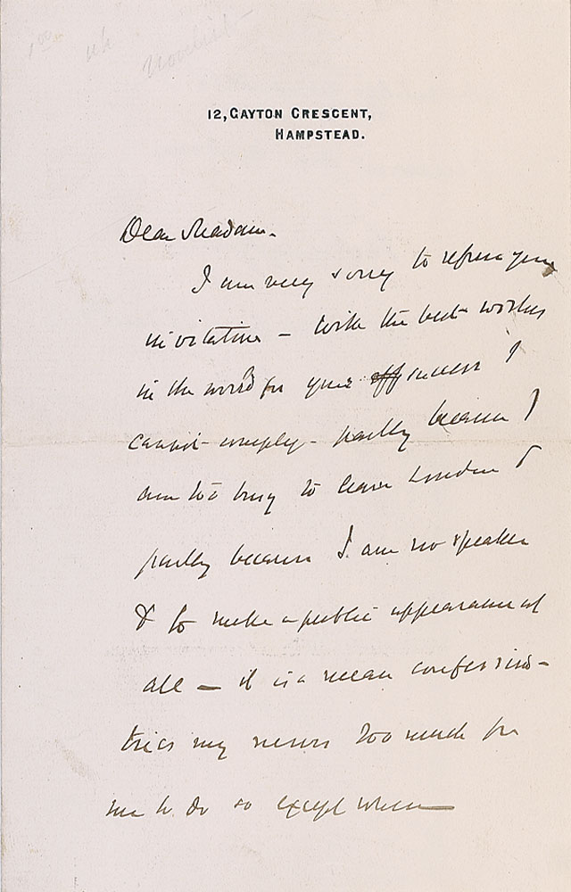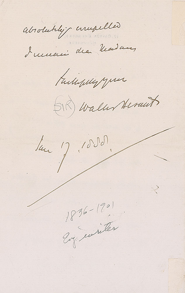 British novelist and historian (1836–1901). ALS, two pages on two adjoining sheets, 4.5 x 7, personal letterhead, January 17, 1888. Letter to an unidentified woman. In part: “I am really sorry to refuse your invitation—with the best wishes in the world for your success I cannot comply because I am…to leave London & partly because I am no speaker.” Pencil notations to last page, one right next to signature, and some light creasing and soiling, otherwise fine condition. RR Auction COA.