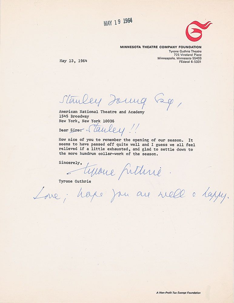 English theatrical director (1900–1971). TLS, one page, 8.5 x 11, Minnesota Theatre Company Foundation letterhead, May 13, 1964. Letter to a friend. In full: “How nice of you to remember the opening of our season. It seems to have passed off quite well and I guess we all feel relieved if a little exhausted, and glad to settle down to the more humdrum collar-work of the season.” In a handwritten postscript he adds, “Love; hope you are well & happy.” In fine condition. Pre-certified PSA/DNA and RR Auction COA.