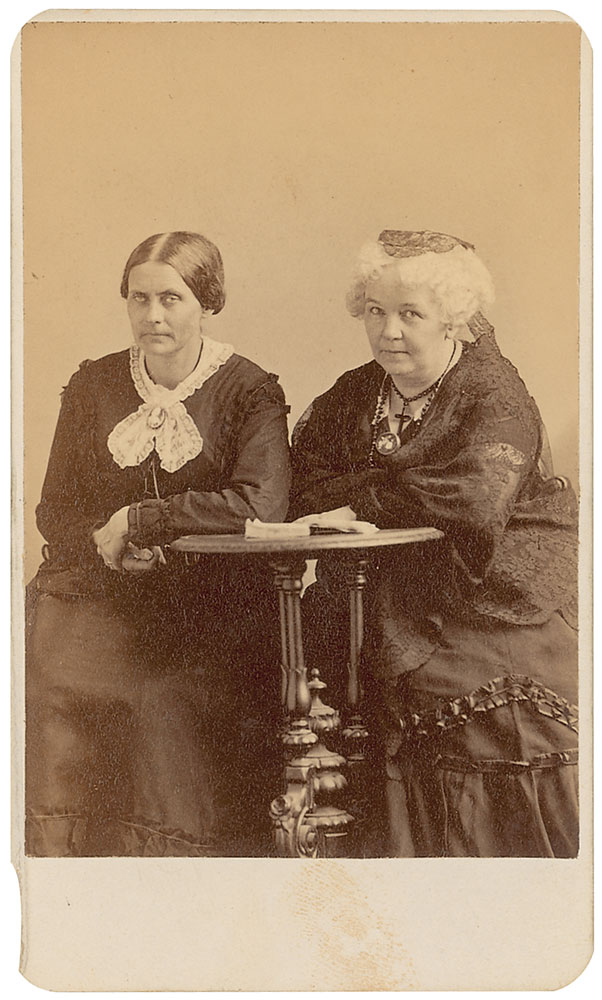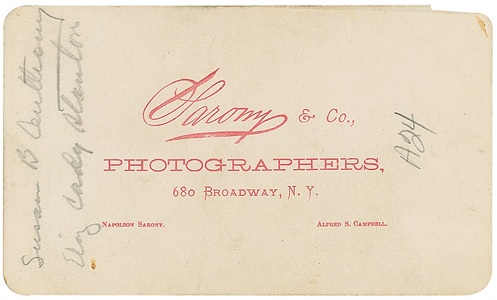 Pioneering American feminists. Unsigned original 2.5 x 4 carte-de-visite portrait of Anthony and Stanton together, by Sarony of New York. Slight paper loss to lower left corner, a fingerprint to the lower border, and mild silvering to dark areas of the image, otherwise fine condition. RR Auction COA.