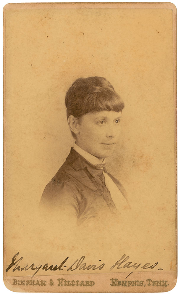 Daughter of Confederate President Jefferson Davis. Original 2.5 x 4 carte-de-visite photo by Bingham and Hilliard of Memphis, Tennessee, signed at the bottom of the image in black ink, “Margaret Davis Hayes.” In very good condition, with scattered toning and foxing to image, slight creases to bottom corner tips, and some mounting remnants to reverse. RR Auction COA.