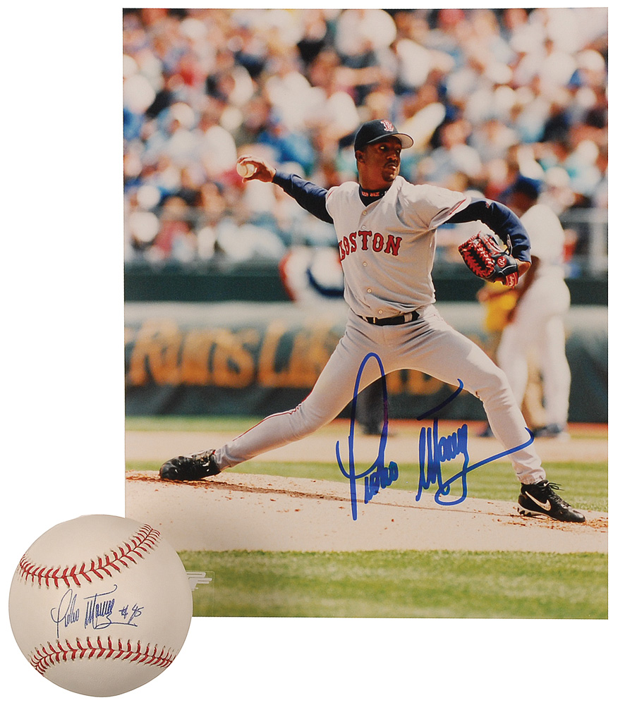 Two items: one official Rawlings Major League baseball signed in blue ballpoint on the sweet spot, “Pedro Martinez #45”; and one color glossy 8 x 10 photo of Martinez pitching for the Red Sox, signed in blue felt tip. In fine condition. RR Auction COA.