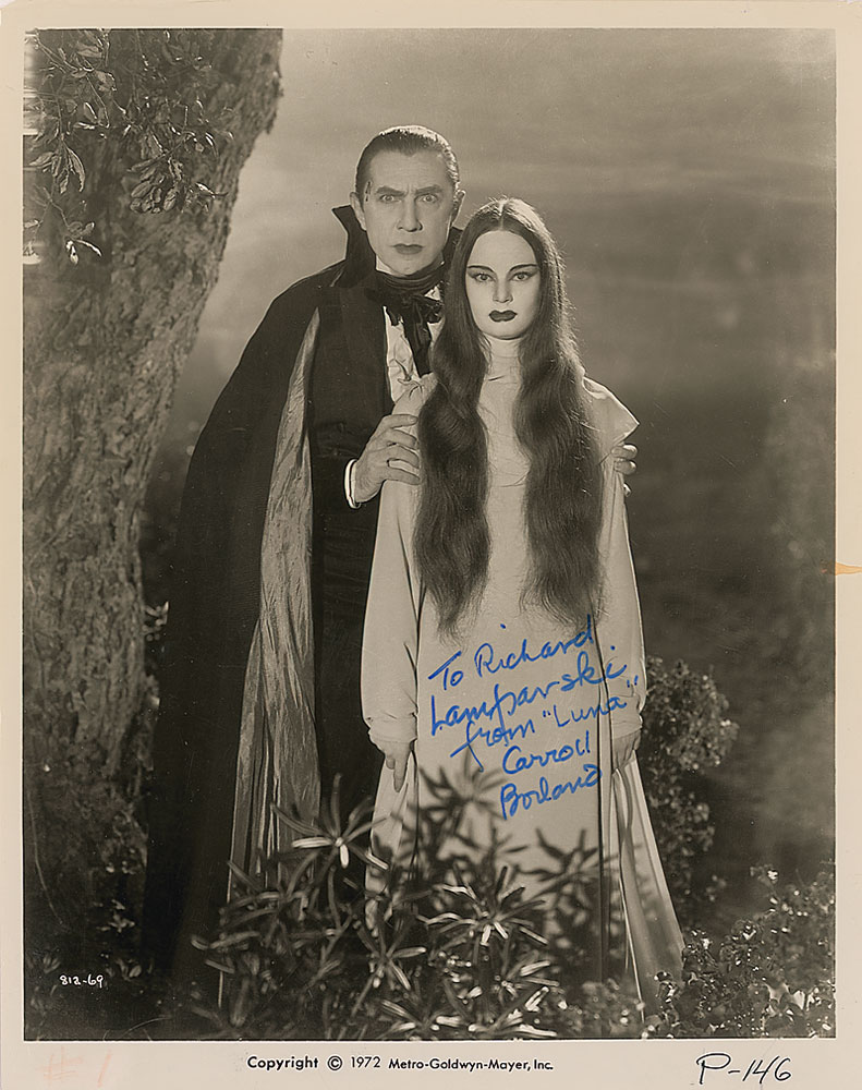 Glossy 8 x 10 MGM promotional photo for Mark of the Vampire, signed and inscribed in blue felt tip, “To Richard Lamparski, from ‘Luna,’ Carroll Borland.” Light corner tip creases, ink notations to lower border, and a stray ink spot to right border, otherwise fine condition. Lamparski, host of the 1960s and 1970s radio show entitled, ‘Whatever Became of…’ was best known for his wit, sarcasm, and sometimes vulgar interviews with various celebrities. Pre-certified PSA/DNA and RR Auction COA.