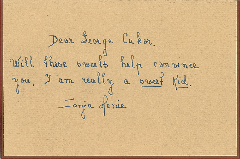 Sonja Henie: “Dear George Cukor, will these sweets help convince you, I am a really sweet kid”