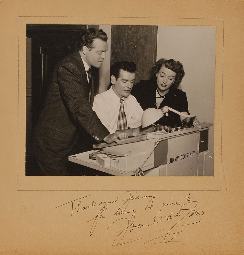 Vintage matte-finish 9.5 x 7.5 photo of Crawford with Van Heflin and Robert Sterling on the set of the 1941 film Johnny Eager, affixed to a 12.25 x 13 mount, signed and inscribed on the mount in fountain pen “Thank you Jimmy, for being so nice to Joan Crawford.” A few surface marks and dings, some light soiling, and a pencil outline around the photo, otherwise fine condition. Pre-certified PSA/DNA and RR Auction COA.