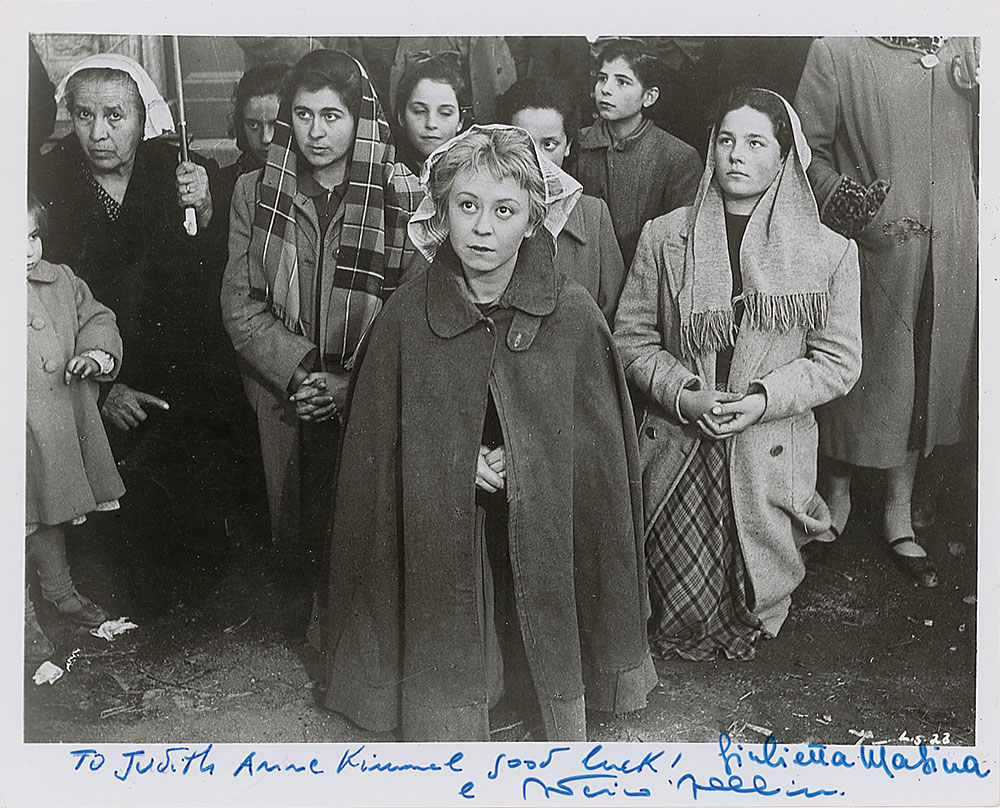 Glossy 10 x 8 photo of a scene from La Strada, signed and inscribed in blue felt tip “To Judith Anne Kimmel, good luck! Federico Fellini” and “Giulietta Masina.” In fine condition, with a few mild surface bends. Pre-certified PSA/DNA and RR Auction COA.