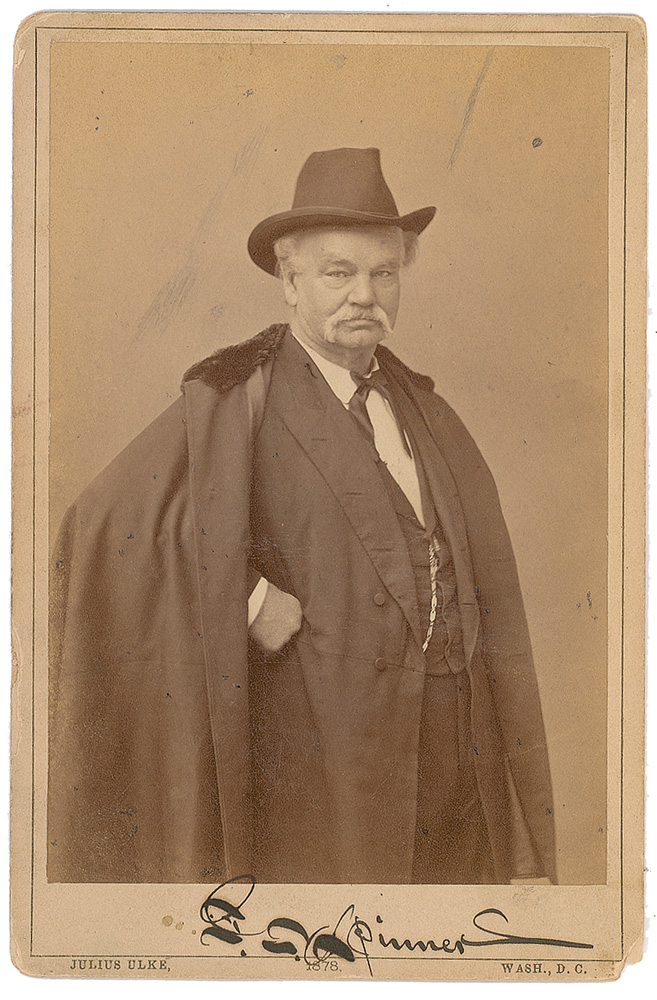 US treasurer during the Civil War who is credited with bringing women into the civil service (1802–1890). Original 4.25 x 6.5 cabinet photo of Spinner in a hat and overcoat, signed in the lower border in black ink, “F. E. Spinner.” In very good condition, with scattered surface marks and rubbing to image, some stray ink marks to background, missing lower right corner tip, and scattered edge wear. Pre-certified PSA/DNA and RR Auction COA.