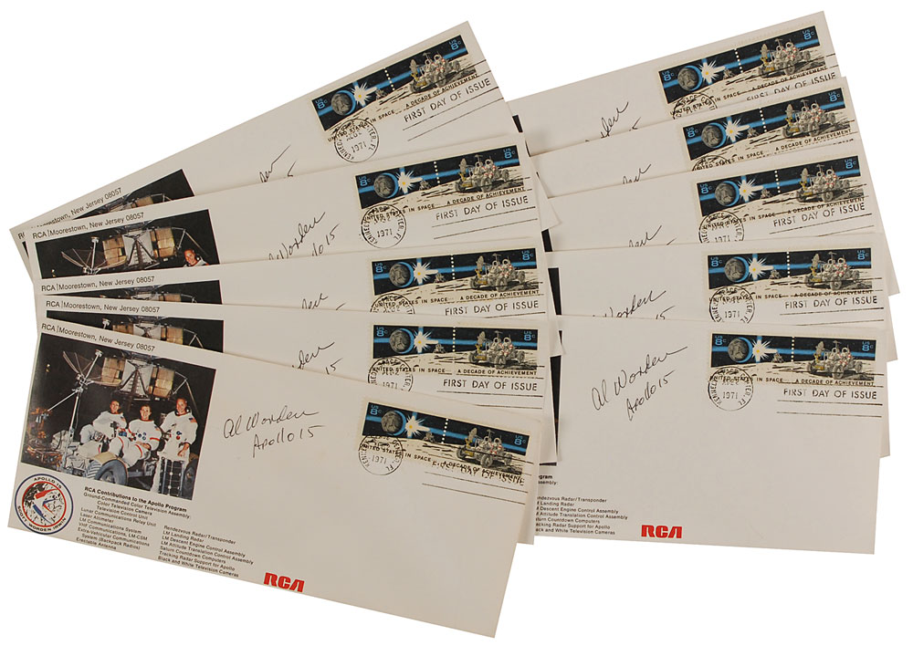 Collection of 10 identical FDCs, 9.5 x 4, with cachets honoring RCA’s contribution to the Apollo program, each signed in black ballpoint, “Al Worden, Apollo 15.” In fine condition. Pre-certified Steve Zarelli and RR Auction COA.