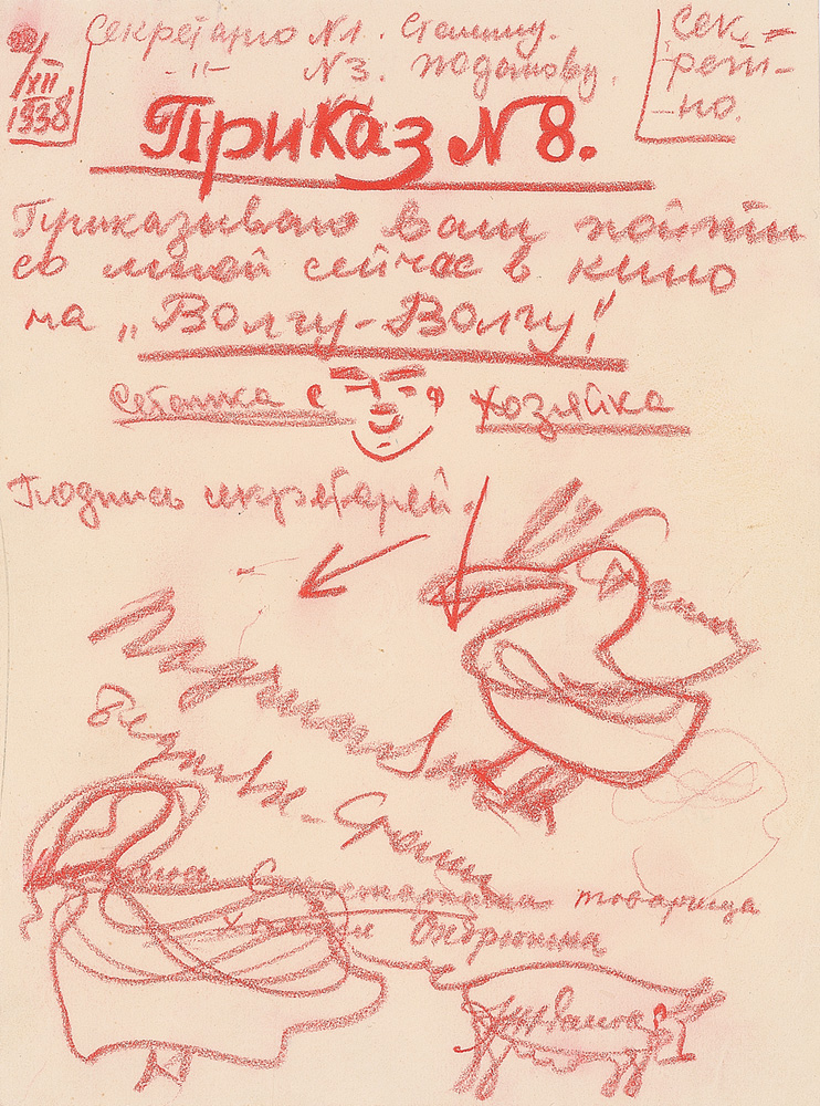 ANS in Russian, signed “I. Stalin,” one page, 5.5 x 7.25, January 22, 1938. Short note written by Stalin beneath a handwritten letter to him from his daughter Svetlana, whom he called Setanka. His daughter writes (translated): “To Secretary N1. Stalin. N3. Gdanov. Secret. Order N 8. Order you to take me to the movies now, to see the film ‘Volga-Volga.’ Setanka the owner,” adding a small facial sketch, and “signatures of the secretaries,” with two arrows and a duck drawing. Underneath Stalin writes: “I. Stalin, To Obey” adding “Poorman – Stalin.” In fine condition. The musical comedy Volga-Volga, released in 1938, became Stalin's favorite film and he would often show off how well he knew it by performing every part just before the actors on screen. In 1942, he actually sent a copy of the film to FDR. Pre-certified John Reznikoff/PSA/DNA and RR Auction COA.