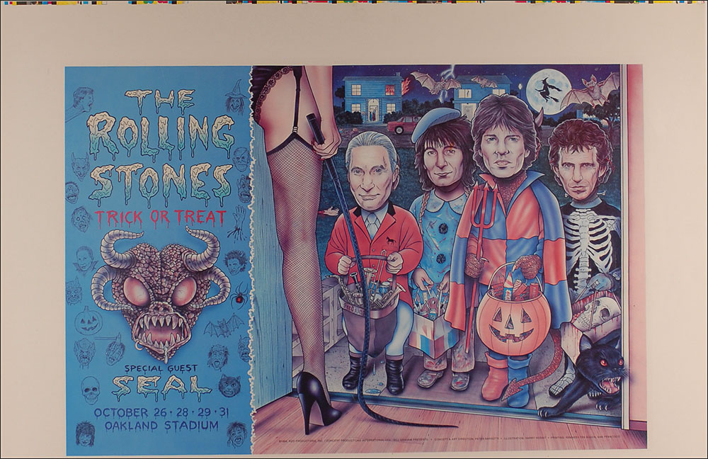 Color 35 x 23 printer’s proof for the Stones series of concerts at the Oakland Coliseum on October 26, 28, 29, and 31, 1994, featuring a caricature of children dressed as the Stones trick or treating. Rolled and in fine condition. RR Auction COA.