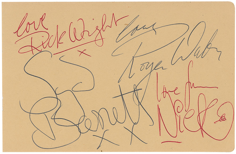 Vintage red and blue ballpoint signatures of all four original members, “Syd Barrett,” “Love, Rick Wright,” “Love, Roger Waters,” and “Love from Nick” on a beige 6 x 4 album page. In fine condition. A seldom-offered combination. Pre-certified Roger Epperson/REAL and RR Auction COA.
