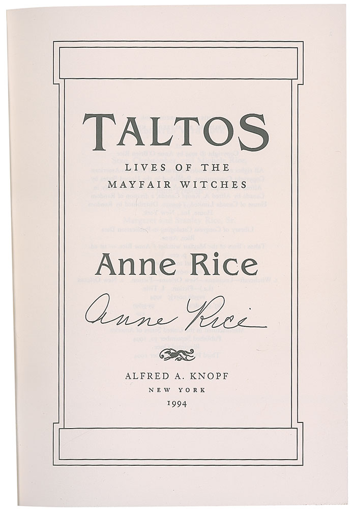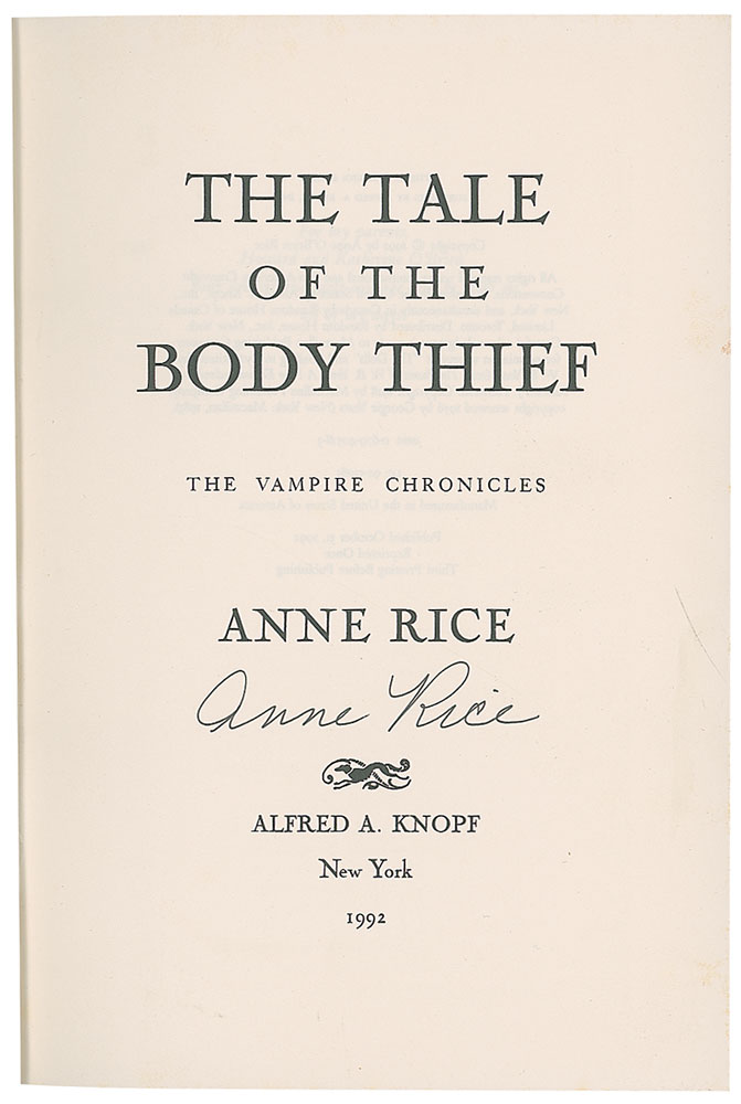 Two hardcover books, The Tale of the Body Thief and Taltos, each signed on the title page in black ink. In fine condition. RRAuction COA.