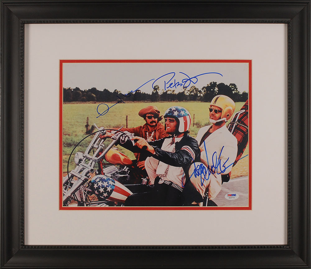 Color glossy 13 x 10 photo, signed in blue felt tip by Dennis Hopper, Peter Fonda, and Jack Nicholson. Nicely double-matted and framed to an overall size of 22 x 18.75. In fine condition, with a PSA/DNA label affixed to the lower right corner. Accompanied by a certificate of authenticity from PSA/DNA. RRAuction COA.
