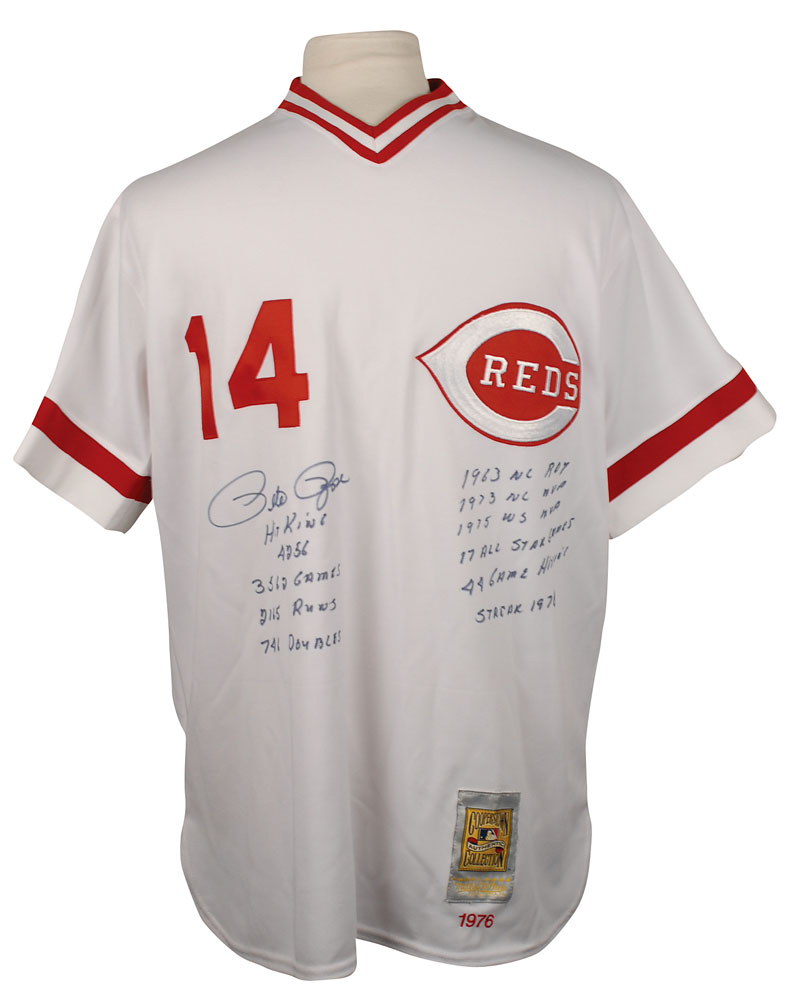 Official Mitchell & Ness Cooperstown Collection replica Cincinnati Reds baseball jersey, with sewn on letters and numbers, signed in black felt tip on the front, “Pete Rose, Hit King,” adding a number of his career stats and achievements. In fine condition. Pre-certified Steve Grad/PSA/DNA and RR Auction COA.