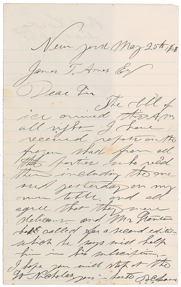 American balloonist (1832–1913) whose Union balloon corps tracked enemy movements, known as the father of military aerial reconnaissance in the United States. Rare ALS signed “T. S. C. Lowe,” one page, lightly-lined, 5 x 8, New York, May 25, 1868. Letter to manufacturer James T. Ames. In part: “The bb’l of ice arrived this A. M. all right—I have received reports on the frozen shad from all the parties who rec’d them including the one used yesterday from my own table, and we all agree that they were delicious.” One vertical fold and some light scattered foxing, otherwise fine condition. Lowe held several patents on ice making machines. RRAuction COA.