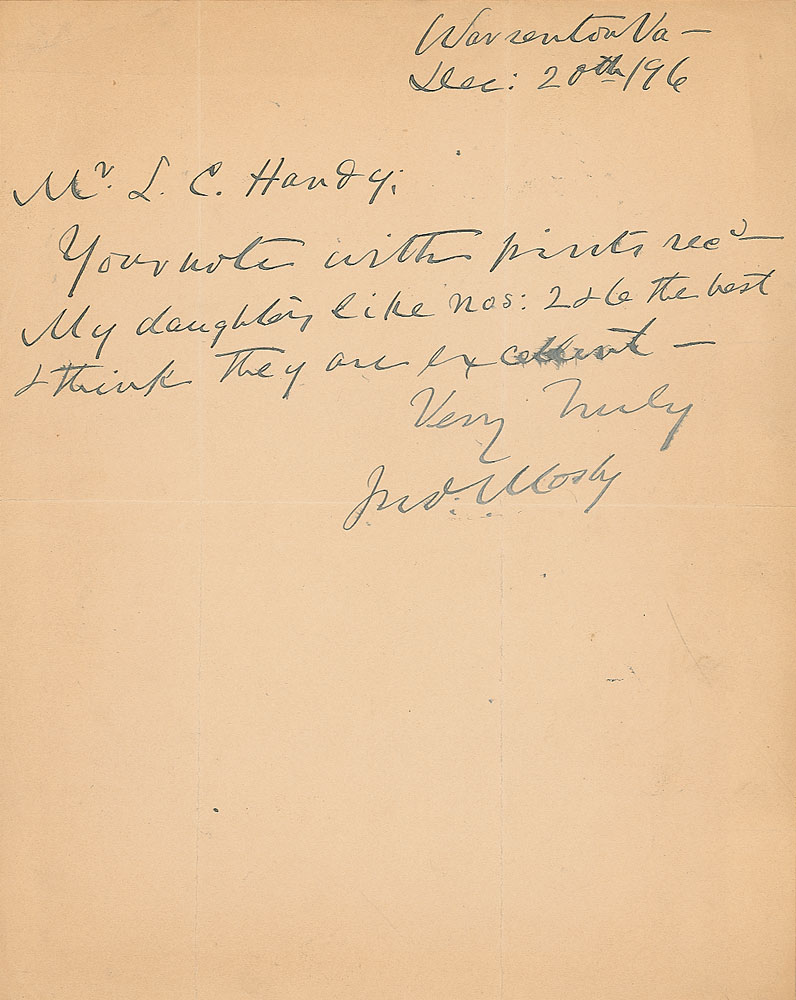 Fabled Confederate ranger (1833–1916) whose guerrilla band specialized in attacking and disrupting Union supply lines. He earned the nickname ‘The Gray Ghost’ for his clandestine and highly effective attack tactics. ALS signed “Jno. Mosby,” one page, 8 x 10, Warrenton, Virginia, December 20, 1896. Letter to photographer L. C. Handy. In full: “Your note with prints rec’d—My daughters like nos: 2 & 6 the best I think they are excellent.” In fine condition, with intersecting folds that pass through the signature, slight separations to edges of the central horizontal fold, light overall toning, and a slight brush to ink in a single word. Pre-certified PSA/DNA and RR Auction COA.