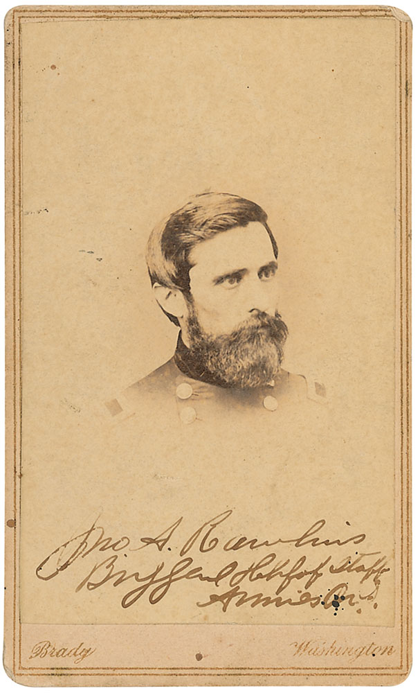Union general (1831–1869) who served as Grant’s aide-de-camp and later as a brigadier general. A close friend and confidant of Grant, Rawlins was appointed secretary of war at the start of his presidency. Original 2.25 x 4 carte-de-visite portrait of Rawlins, by Brady of Washington, signed at the bottom of the image in black ink, “Jno. A. Rawlins, Brig. Genl, Chf. of Staff, Armies U. S.” Scattered surface marks and dings, and mild silvering to dark areas of the image, otherwise fine condition. RRAuction COA.
