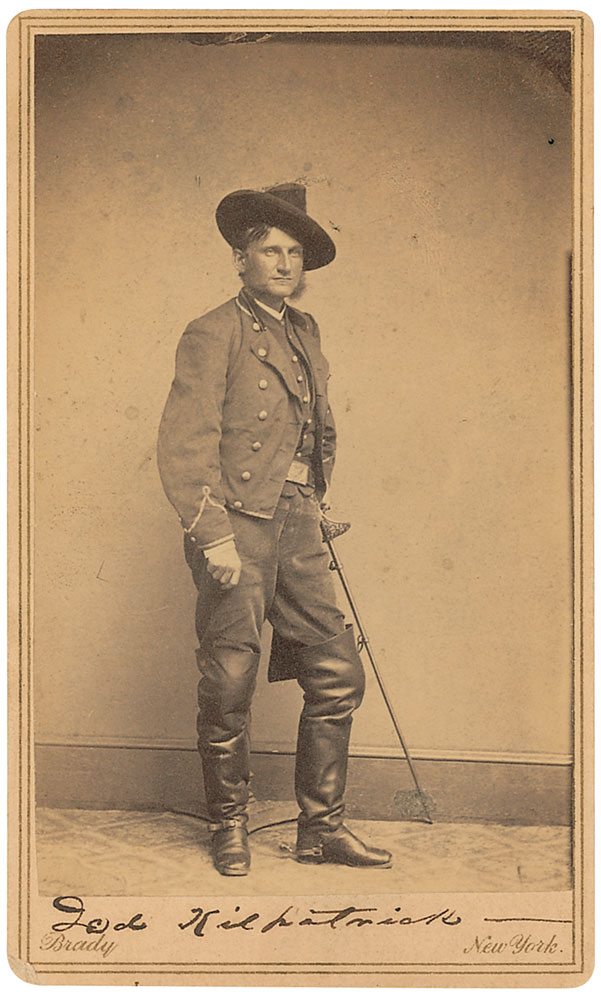 American military officer (1836–1881), who, as a general in the Civil War, earned the sobriquet ‘Kill-Cavalry’ for his gung-ho disregard for the lives of the soldiers under his command. Civil War-dated original 2.5 x 4 carte-de-visite full-length portrait of Kilpatrick in uniform, by Brady of New York, signed in the lower border in black ink, “Jud Kilpatrick.” On the reverse, Kilpatrick added his rank, “Colonel 2nd N. Y. Cav., ‘Harris Light,’ June 1863.” In fine condition, with slight corner tip dings and some mild spotting to the finish. RRAuction COA.