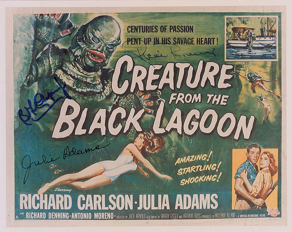 Color glossy 10 x 8 photo of a Creature from the Black Lagoon movie poster, signed in blue and black felt tip by Ben Chapman, Jr., Julie Adams, and Ricou Browning. In fine condition. Pre-certified PSA/DNA and RR Auction COA.