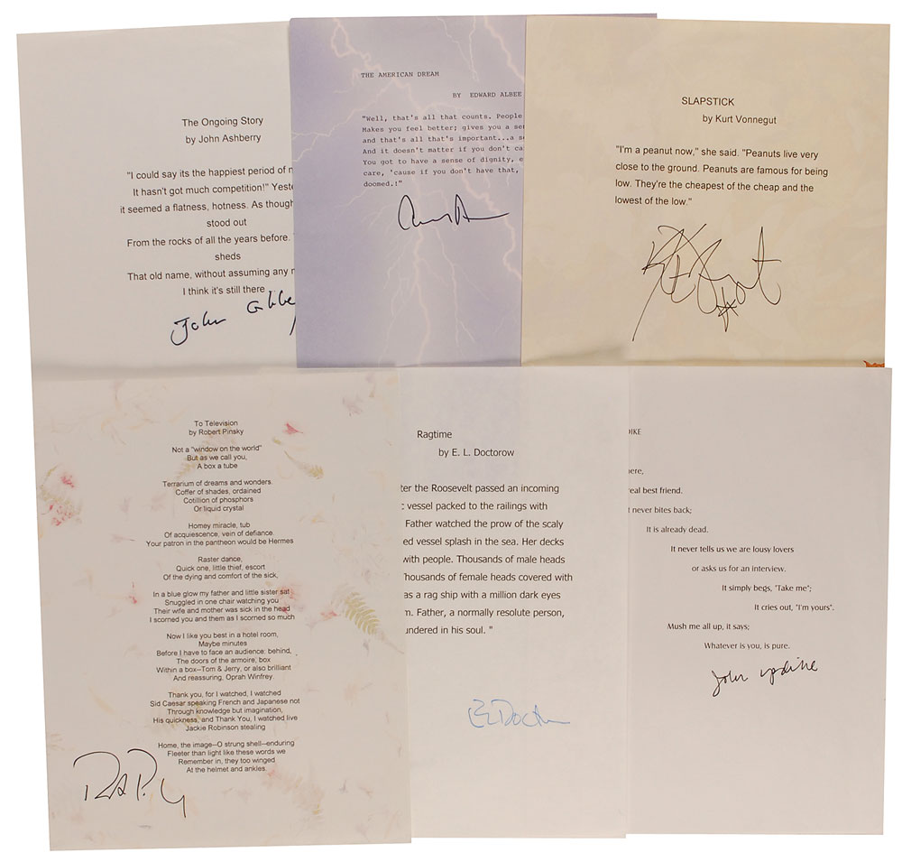 Six souvenir typescripts, each 8.5 x 11, each signed at the conclusion in blue or black felt tip by its author. Included are excerpts from Slapstick by Kurt Vonnegut, ‘Food’ by John Updike, Ragtime by E. L. Doctorow, ‘The American Dream’ by Edward Albee, ‘To Television’ by Robert Pinsky, and 'The Ongoing Story' by John Ashbery. Some light rippling to edges and a few light pencil notations, otherwise fine condition. RRAuction COA.
