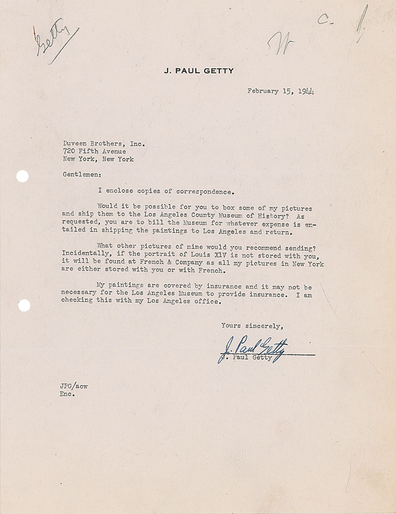 TLS, one page, 8.5 x 11, personal letterhead, February 15, 1944. Letter to Duveen Brothers, Inc. In part: “Would it be possible for you to box some of my pictures and ship them to the Los Angeles County Museum of History?…What other pictures of mine would you recommend sending? Incidentally, if the portrait of Louis XIV is not stored with you, it will be found at French & Company as all my pictures in New York are either stored with you or French.” A horizontal mailing fold passing through the signature, a crease and paperclip impression to the upper left, filing holes to the left border, and a few pencil office notations, otherwise fine condition. RRAuction COA.