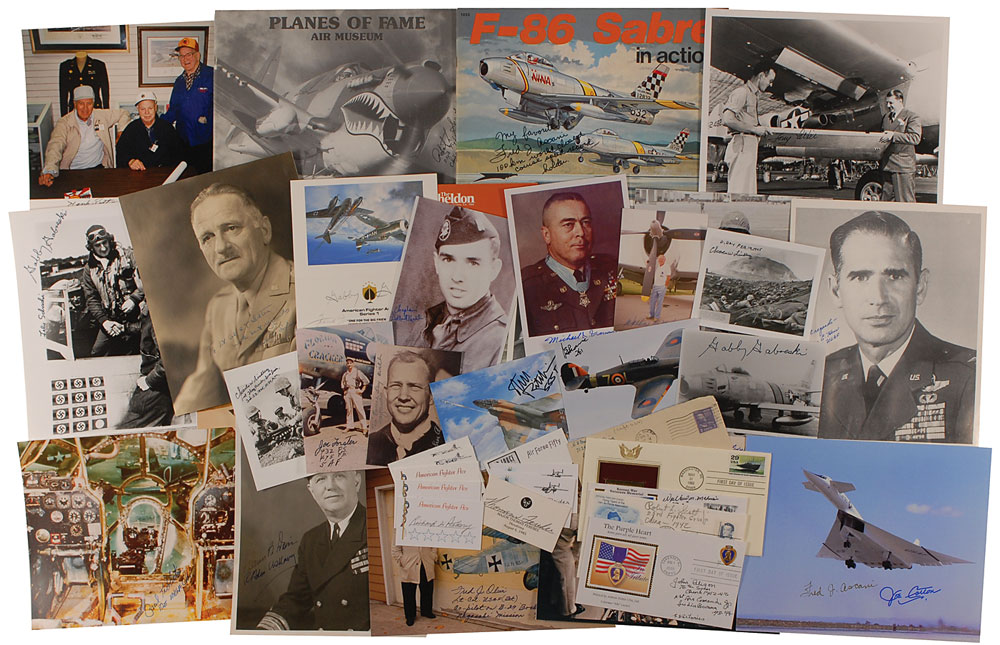 Collection of approximately 136 items consisting primarily of signatures, letters, covers, photos, and prints, signed by various aces including members of the Flying Tigers, Doolittle’s Raiders, and Medal of Honor recipients. Highlights include items signed by Arthur ‘Bomber’ Harris, Carl Spaatz, Ray Davis, Nathan Twining, Walter Krueger, John Vessey, Roy Davenport, Bob Elder, Raymond Spruance, Arleigh Burke, and Harold Stassen. Although 136 is the total number of items, there are approximately 181 signatures contained within this lot when multi-signed items are taken into account. In overall fine condition.