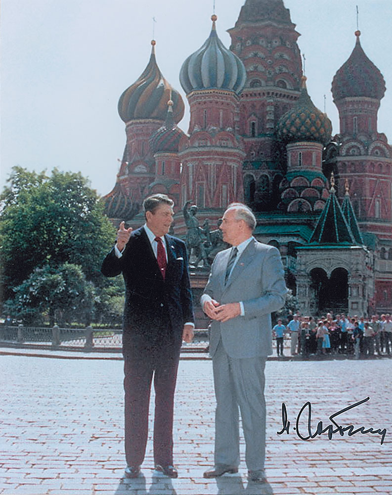 Color satin-finish 8 x 10 photo of Gorbachev and Ronald Reagan standing in front of St. Basil’s Cathedral, signed in black felt tip. In fine condition. RRAuction COA.